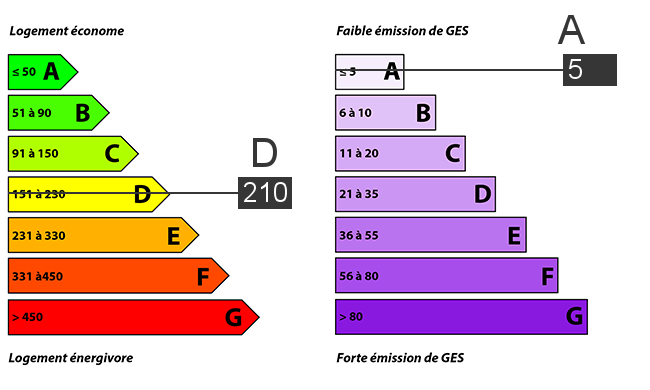 DPE & GES C-A (153-4) Les coûts sont estimés en fonction des caractéristiques de votre logement et pour une utilisation standard sur 5 usages (chauffage, eau chaude sanitaire, climatisation, éclairage, auxiliaires) voir p.3 pour voir les détails par poste. entre 1 710 euros et 2 370 euros par an Prix moyens des énergies indexés sur les années 2021, 2022, 2023 (abonnements compris).
